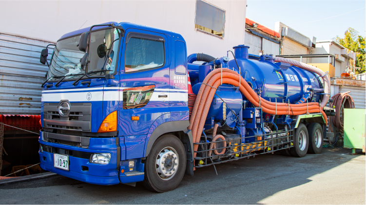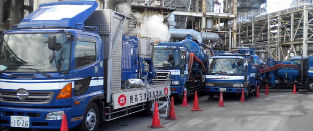 超高圧洗浄車や超強力吸引車をはじめとする特殊車両を使って、上下水道やプラント(ボイラー炉・ごみ焼却炉・貯水タンク・排水設備・排煙設備)などの清掃工事やメンテナンスを行っています。多彩な清掃工事を可能にする特殊車両を数多く保有しており、それを取り扱う資格を持った技術者も多数存在していることが当社の強みです。